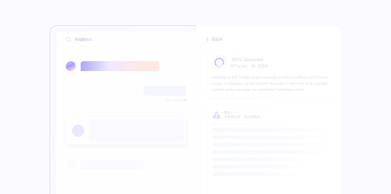 依托通义大模型构建反欺诈模型,实时解析社交内容特征,精准预警情感投资类风险,高效识别身份伪装、诱导行为及违规信息。