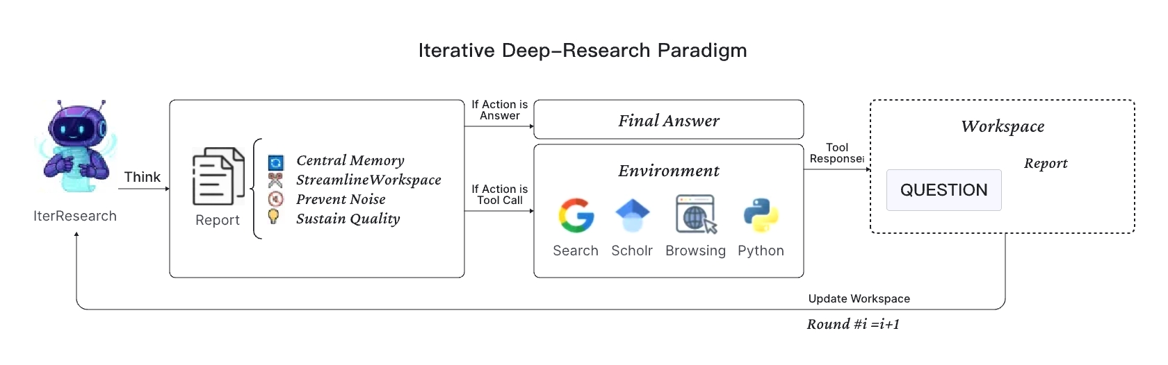 通过这种设计,IterResearch 实现了对研究过程的“严谨状态维护”,而非“单窗口信息堆叠”。