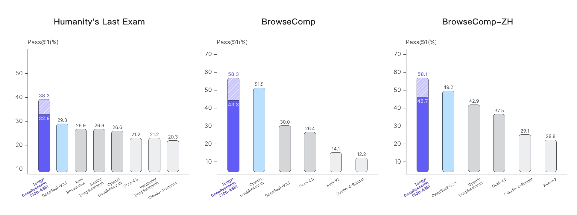 我们推出了 通义千问深度研究,这是一个具有300亿总参数的代理大语言模型,每个令牌仅激活30亿参数。该模型由通义实验室开发,专门用于长期、深入的信息检索任务。通义-深度研究在一系列代理搜索基准测试中展示了最先进的性能,包括人类最后的考试、BrowserComp、BrowserComp-ZH、WebWalkerQA、GAIA、xbench-DeepSearch 和 FRAMES。