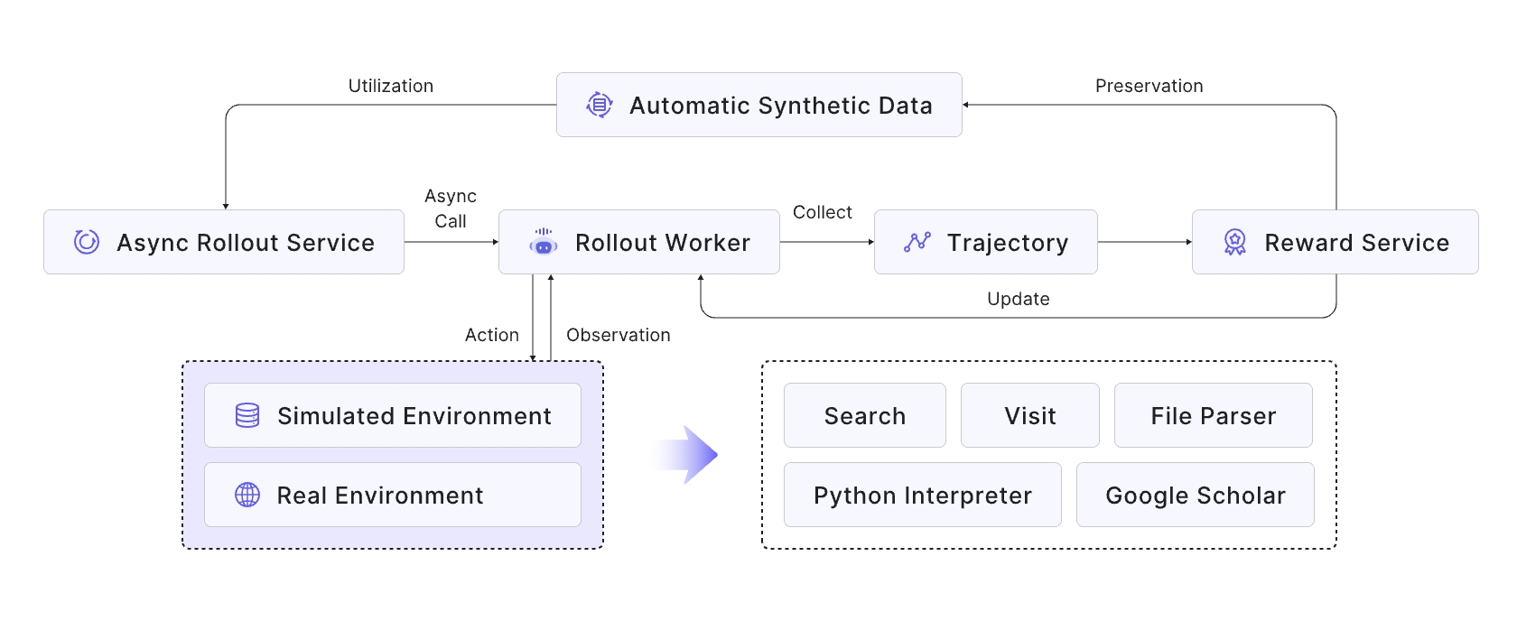 在基础设施方面,使用工具训练智能体需要一个高度稳定高效的环境: