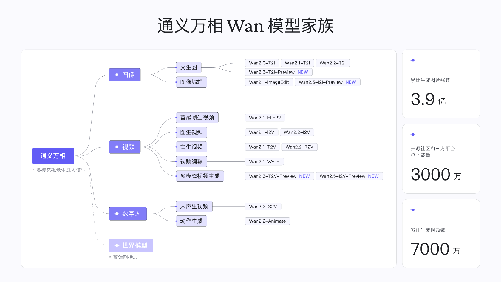 https://img.alicdn.com/imgextra/i3/6000000001619/O1CN01MtPf3z1NpYKaR6Vu7_!!6000000001619-0-tbvideo.jpg通义万相模型家族已支持文生图、文生视频、图生视频、人声生视频和动作生成等10多种视觉创作能力,累计生成3.9亿张图片、7000万个视频。自今年 2 月以来,通义万相已连续开源20多款模型,在开源社区和三方平台的下载量已超3000万。