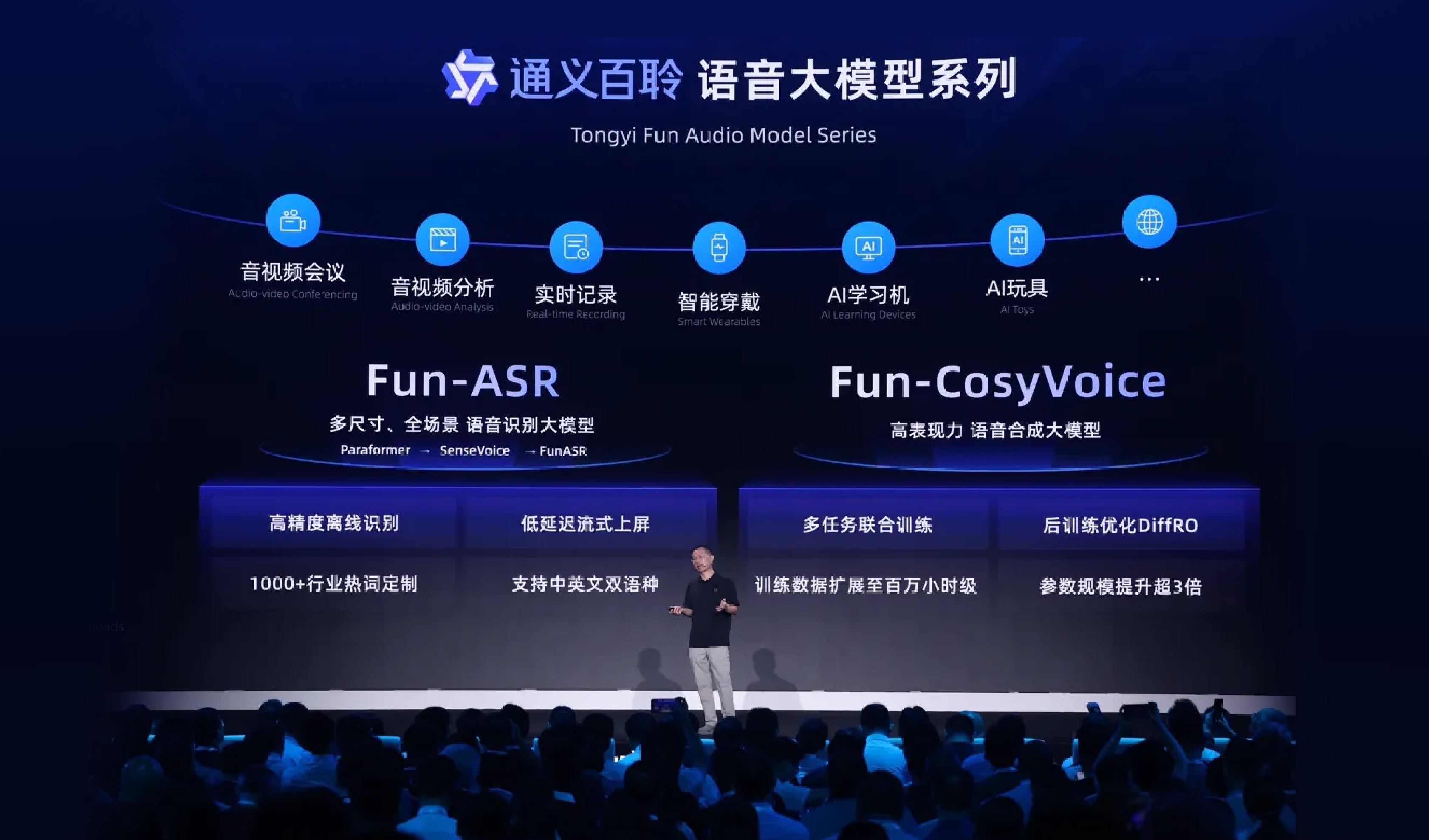 · 语音识别大模型:Fun-ASR基于数千万小时真实语音数据训练而成,具备强大的上下文理解能力与行业适应性,该模型增强了上下文感知和高精度语音转写能力,目前,Fun-ASR 已应用于会议字幕与同传、智能纪要、语音助手等场景,未来该模型将进一步在阿里云百炼上线。