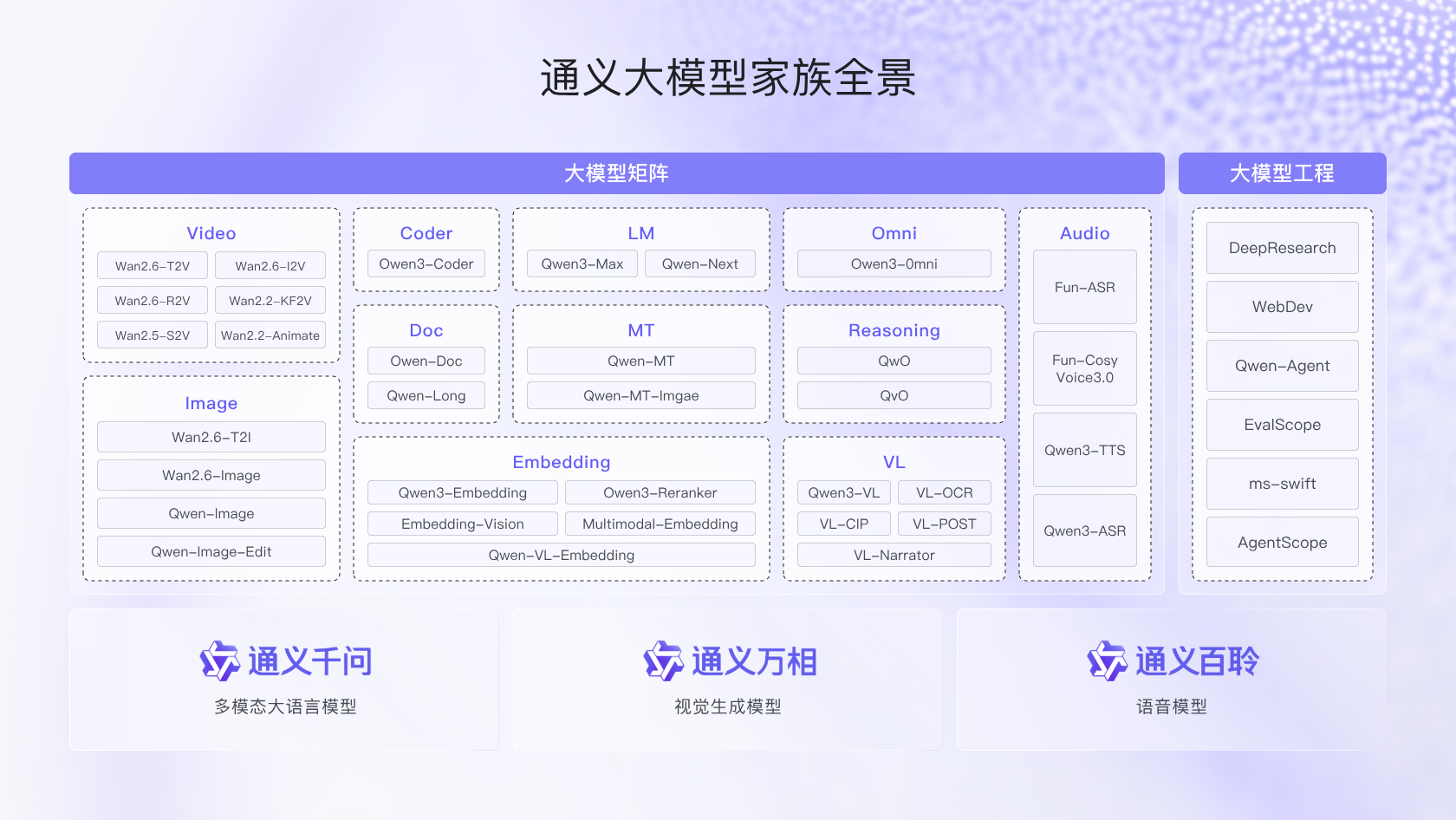 · 语音模型: 通义千问系列包括多款面向音频的多模态大模型,包括音频语音模型Qwen-Audio、Qwen2-Audio,Text To Speech 模型Qwen-TTS、语音识别模型Qwen3-ASR。