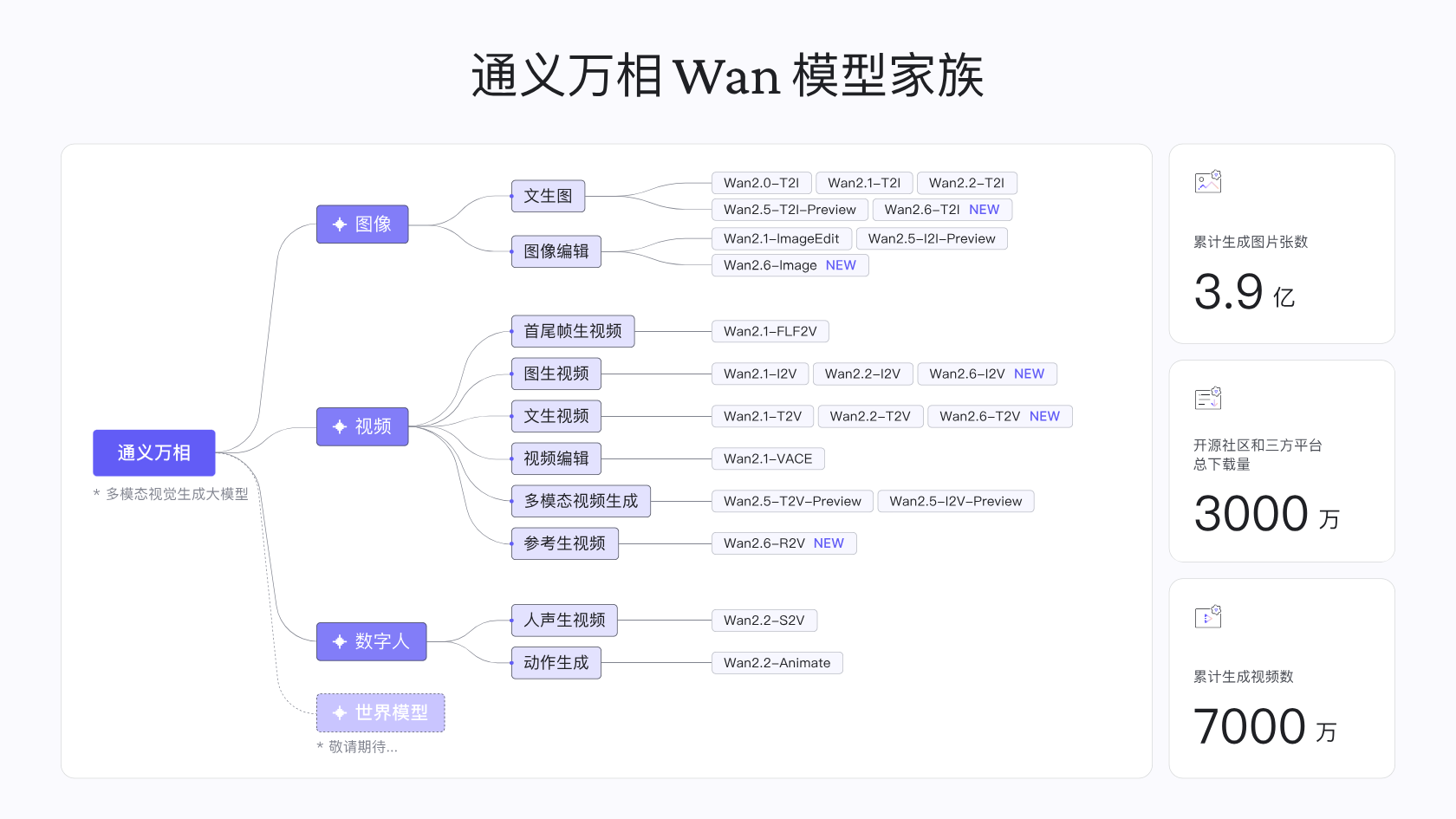 2023年7月, 通义万相(Wan)正式发布。2025年2月,wan2.1系列正式发布并开源,2025年7月,wan2.2系列视频生成模型正式发布并开源,2025年9月,Wan2.5-Preview发布,2025年12月,Wan2.6系列发布。通义万相系列模型包括文生音视频、图生音视频、声音生视频、视频编辑、文生图、图片编辑、数字人等多种功能模型。