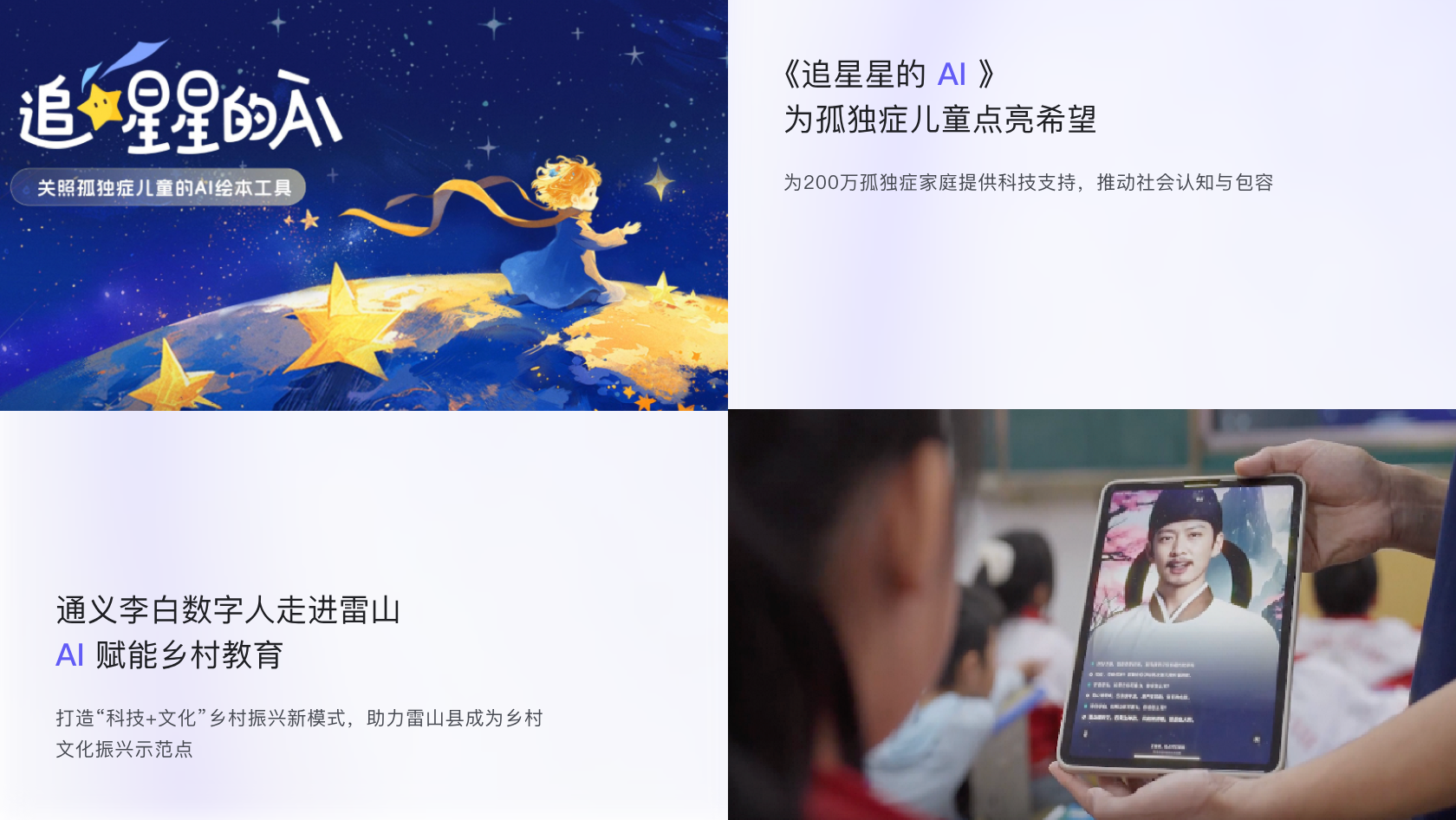 在2024世界人工智能大会上,阿里巴巴携手上海美术电影制片厂、中国青少年发展基金会“阅读中国”基金,孤独症儿童干预机构恒星乐乐、海豚乐乐,联合发布公益产品“追星星的AI”。这也是国内首个关照孤独症儿童的AI绘本工具。“追星星的AI”基于阿里自研ModelScope-Agent框架,调用了通义大模型的多项服务。