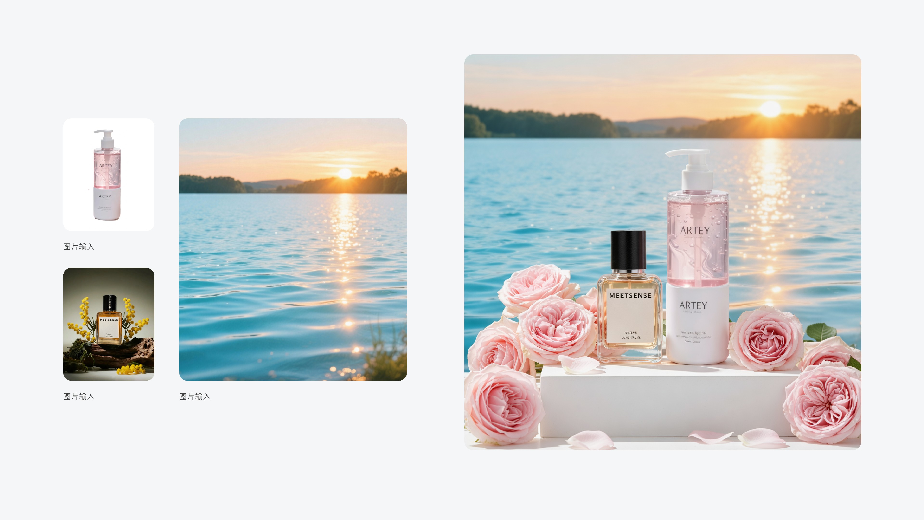 提示词:美妆护肤产品宣传图,主体是图一和图二的商品,产品垂直摆放在浅白色平台表面,背景为图三。场景中,平台上及周围分布着多朵盛放的浅粉色玫瑰花,花瓣质感柔软且带有自然纹理,部分花瓣散落。以平视视角拍摄,运用三分构图技法,将主体置于画面中右侧区域,突出场景的空间感与层次。场景设定为户外自然的美妆护肤产品展示场景。整体色彩以浅粉色、白色、浅蓝色为主色调,营造出清新自然、浪漫唯美的色彩氛围,突出产品的护肤与自然成分质感。