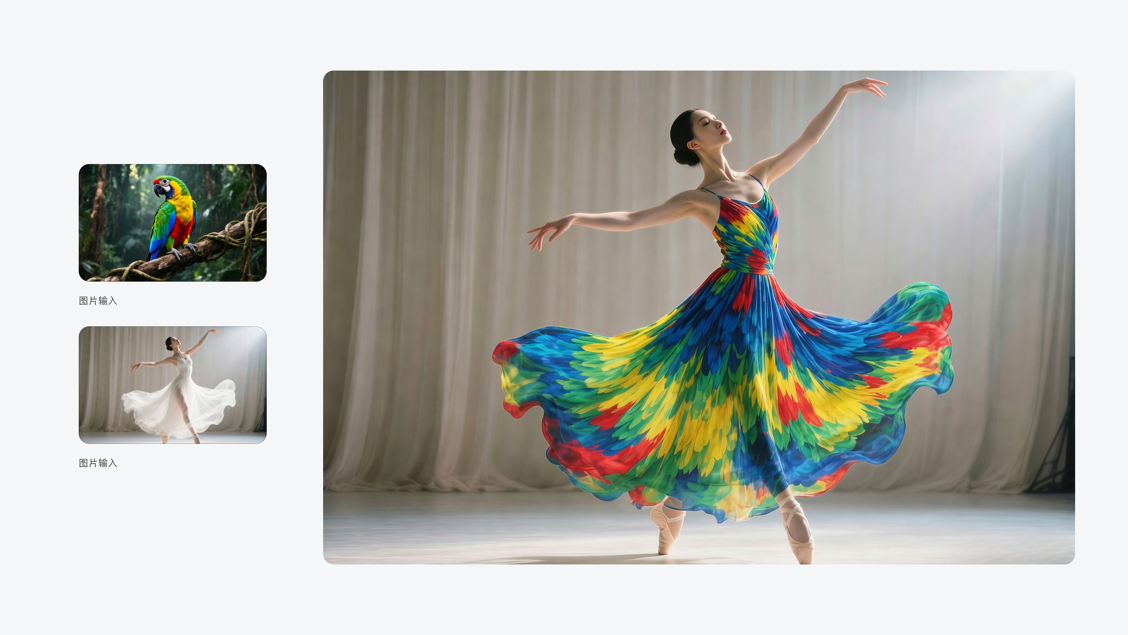 提示词:给图2的裙子按照图1鸟的颜色进行配色,充满艺术感,衣服款式不变,模特不变