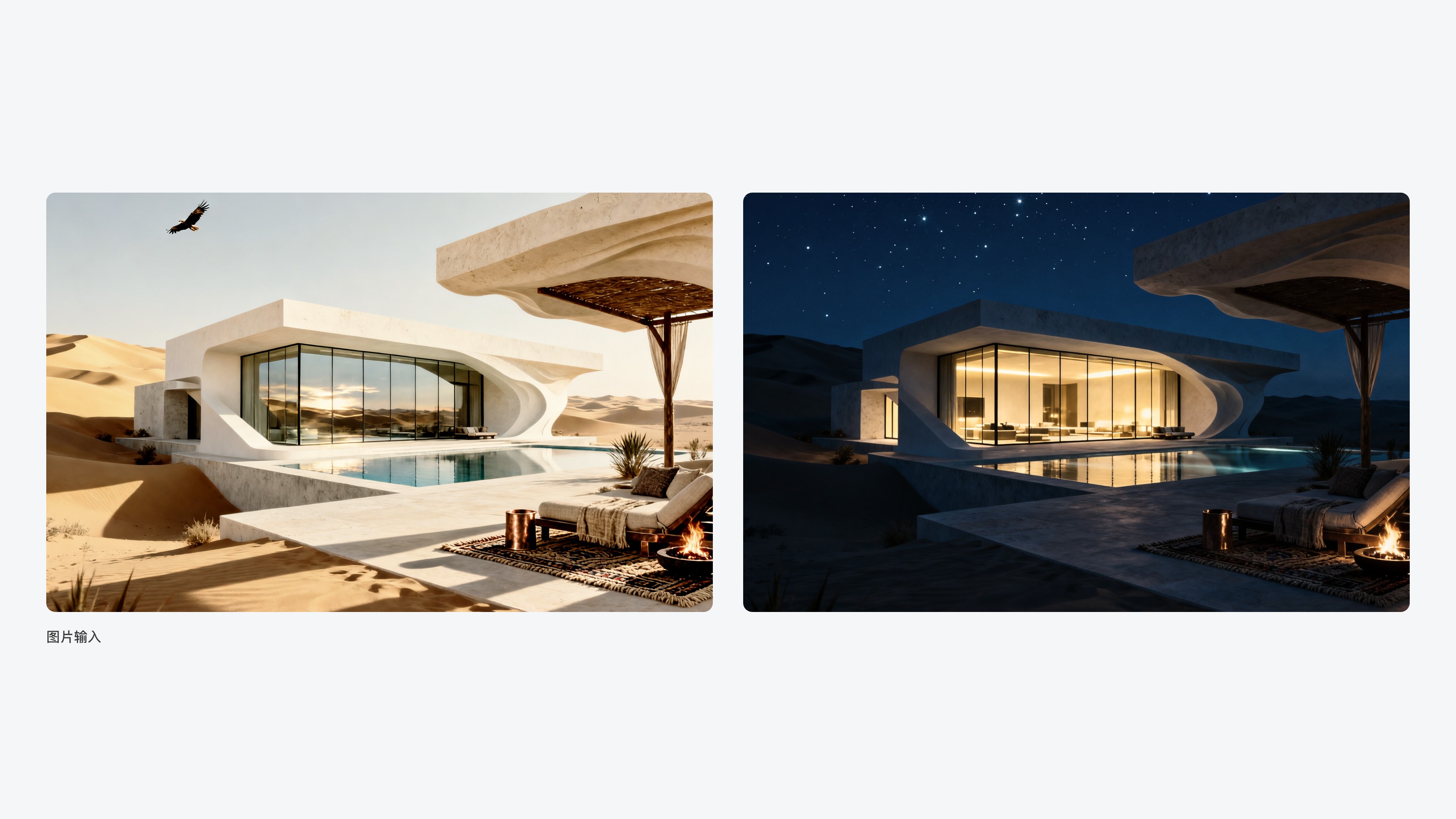 提示词:生成一套空旷沙漠中的干净洁白的极简风格别墅,像迪拜Al Maha Desert Resort风格的,看起来非常昂贵,世界顶级奢享品质。参考沙丘电影中的 审美风格;改为夜晚场景,别墅窗户中透露出低调却高级的灯光。