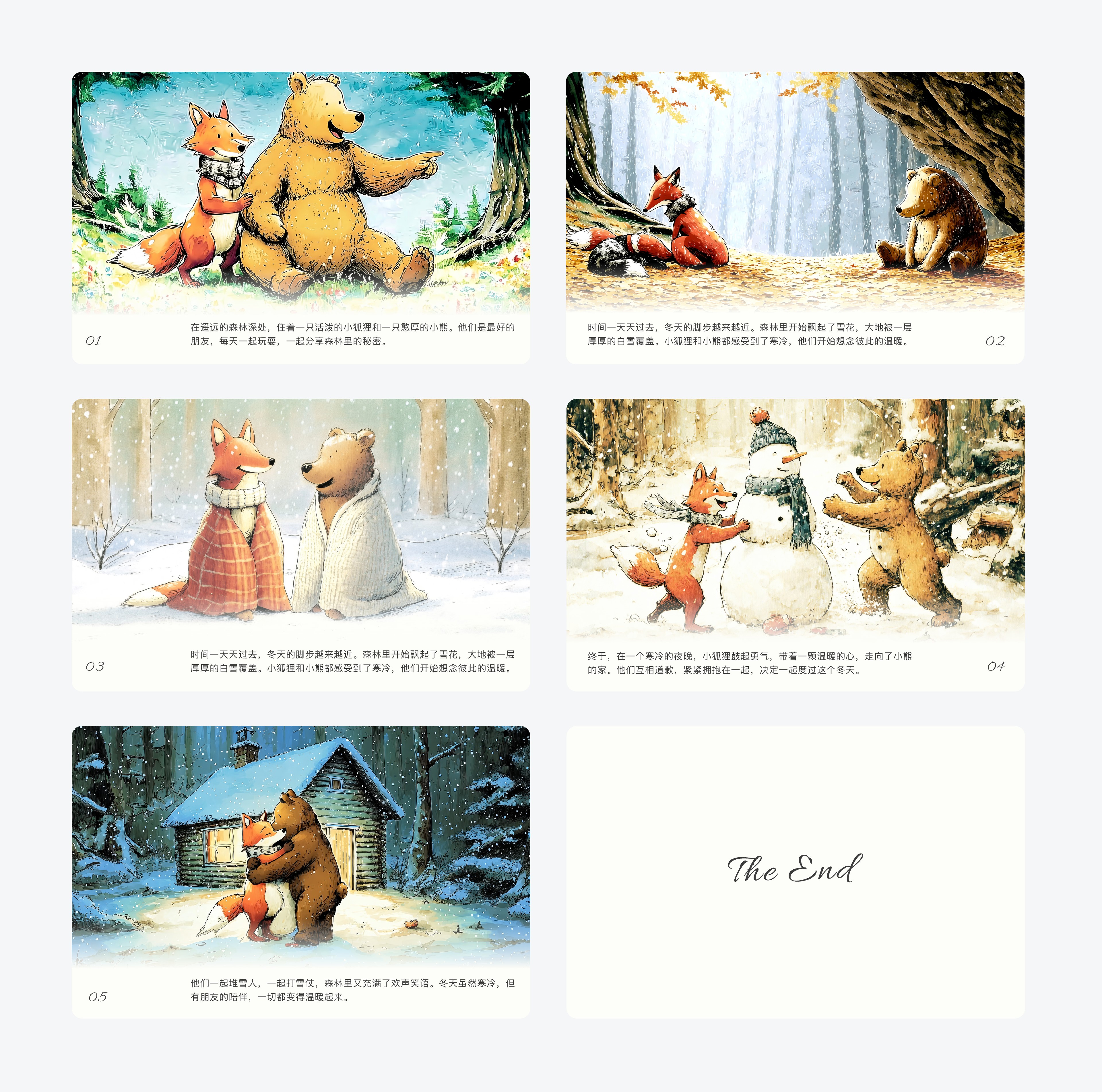 提示词:我想创作一个关于“友谊”的绘本,主角是一只小狐狸和一只小熊。故事讲的是他们在冬天来临前闹了别扭。请你为我生成一个分段叙述、图文交错的故事版本,每一段文字都搭配一张详细的插画描述,描绘他们友谊的小插曲和冬日前的和解。